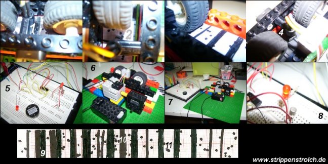 Ich habe die Streifen eins bis fünf nacheinander über den Reflexkoppler gezogen und nur bei den Strichen von Nummer 4 wurde die rote LED dunkel. Auf Streifen 6 habe ich getestet, wie breit die Striche sein müssen, damit der Reflexkoppler sie erkennt. Die Schaltung spricht erst an, wenn die einzelnen Striche dicker als ca. 2 mm sind. Nun zu Streifen # 7 : ![]() Die Striche 1 - 3 sind mit dem Edding Nr. 780 gemalt. Dann bemerkte ich, dass der Stift auslief und nahm stattdessen den "Fineliner" STABILO Point 88 (fine 0,4) für die restlichen Striche 4 bis 8. Jetzt zog ich den Streifen über den Reflexkoppler und mir fiel auf, dass die Leuchtdiode nur bei den Strichen 1,2 und 3 aus ging. Nun kam Papa, der strippenstrolch.de, dazu, und ich erzählte ihm, was ich soeben herausgefunden hatte. Er sah sich den Streifen genauer an und sagte: "Guck' mal, diese Streifen glänzen ja!". Nun sah ich mir den Edding genauer an und endeckte folgenden Text: "... lichtbeständig, deckend, vor Gebrauch schütteln ..." "Ob das wohl was damit zu tun hat?", dachte ich und zeigte den Text dem strippenstrolch.de und dieser sagte: "Achsooooo! Also gibt es Schwarztöne, die das Licht reflektieren!" "Das kann sein", sagte ich, "aber es kann auch sein, dass das 'Finelinerschwarz' das Infrarot des Reflexkopplers nicht schluckt und reflektiert." In der Zwischenzeit habe ich ein bisschen mit dem Reflexkoppler gebastelt, und dabei ist diese Maschine herausgekommen: ![]() Erklärungen: