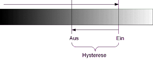 Das sieht so also alles noch nicht sehr gut aus. Wenn man die Schaltung so wie hier benutzen möchte, so sollte man einen Darlingtontransistor anstatt des 2N2222 einsetzen. Ich benutze aber sehr gern das CMOS IC 4093 (Schmitt Trigger), und von CMOS-ICs weiß man, dass die sehr hochohmig sind, also ein sehr kleiner Eingangsstrom ausreichen könnte. Außerdem würde es vielleicht aus dem kontinuierlichen Signal ein schönes Rechteck "zaubern". Wir könnten auch etwas mit der Spannung machen, irgendwie einen hochohmigen Pull-Up-Widerstand oder so... Das wollen wir doch gleich mal sehen: ![]() Uuups, wenn ich dachte hochohmig, dann rechnete ich doch nicht damit, einen 2,2 Megaohm Widerstand einsetzen zu müssen. Aber dieser Versuchsaufbau funktioniert einwandfrei, bei schwarzem Untergrund bleibt die LED dunkel, bei weißem Grund schaltet die Led bei etwa 5 mm Abstand ein. Schön "scharfkantig", so wie unsere Digitalschaltung das haben möchte. Du kannst diese Schaltung bereits einsetzen, indem Du den Pin 3 des 4093 als Ausgang benutzt (orangener Kreis). Möglicherweise ließe sich anstatt des CMOS 4093 auch gleich direkt ein Microcontroller anschließen. Es kommt dann jedoch darauf an, wie hochohmig seine Eingänge sind. Zum Schluss hier noch einmal eine Impression des Steckbretts, es ist wirklich alles recht einfach steckbar: ![]() Übrigens ist der CNY70 doch ein wenig empfindlich gegenüber Fremdlicht. Man sollte keine Lichtquellen direkt auf die Linsen richten, sonst "schaltet" der CNY70 durch. Ein Versuch mit obiger Schaltung und diesem Graukeil ergab folgende Einschaltschwelle: ![]() Aber oftmals ist ja eine Hysterese erwünscht. Wenn man nun beispielsweise eine helle Papiermarke auf eine Motorwelle klebt und die Schaltung an einen Frequenzzähler oder Oszilloskop anschlösse, so könnte man die Drehzahl der Motorwelle bestimmen. Auch viele Bastelroboter nutzen einen CNY70 Reflexsensor, um z.B. schwarzen Linien folgen zu können. Aber Achtung, Jan (12) hat das