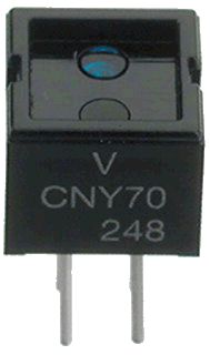 Um etwas berührungslos detektieren zu können bietet sich z.B. der Reflexkoppler CNY70 an. Er wird in vielen Selbstbaurobotern eingesetzt. In diesem Beitrag soll es aber nur darum gehen, ein vernünftiges Signal aus diesem Koppler "herauszukitzeln", das dann weiterverarbeitet werden kann. Wenn wir z.B. das Datenblatt betrachten (Download PDF, 105kB), so werden wir feststellen, dass dieses recht "sparsam" ausfällt. Daher werden wir uns nun ein wenig mit dem CNY 70 vertraut machen. Nachdem wir ihn aus der Tüte ausgepackt haben, gucken uns 2 blaue "Augen" an: ![]() Ein hellblaues und ein dunkelblaues. Hinten gucken vier "Füße" heraus. Obwohl das Datenblatt verspricht, dass auf dem Gehäuse ein weißer Punkt zur Kennzeichnung eines bestimmten Beinchens aufgedruckt sei, konnte ich bei meinem Exemplar keinerlei weißen Punkt erkennen. --------------------------------------------------------------------