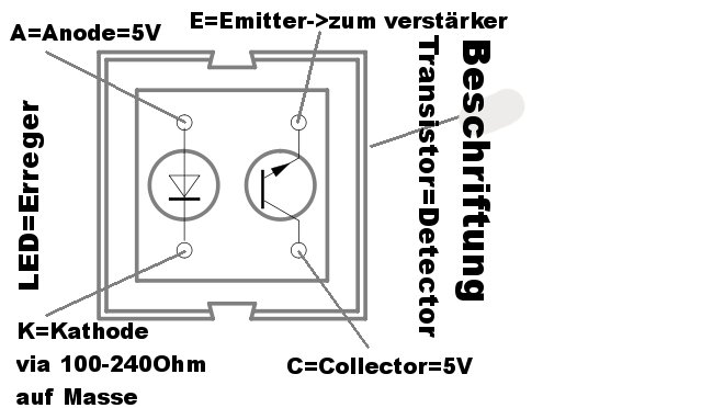10.01.2012 Ein Leser hat dazu folgendes Bild gezeichnet: Ansicht auf die Linsenseite: ![]() "Beschriftung" ist die Seite des Kopplers mit dem Aufdruck. Vielen Dank an Lothar S. ------------------------------------------------------------------- Beschäftigen wir uns nun zunächst kurz mit dem internen Aufbau und der Funktionsweise des Kopplers. Der Koppler besteht an der einen Seite aus einer LED, die in einer unsichtbaren Frequenz strahlt und an der anderen Seite aus einem Fototransistor, dessen Basisanschluss nicht herausgeführt ist. Die LED wirft ihr Licht durch die eine blaue Linse auf eine reflektierende Unterlage (z.B. weißes Papier). Die Unterlage reflektiert den Lichtstrahl zum Fototransistor durch die zweite blaue Linse hindurch. Die Linsen sind so eingefärbt, damit Fremdlicht möglichst wenig stört. Zunächst also einmal das Schema: ![]() So ähnlich wird das Licht von der Diode zum Transistor reflektiert. Klar ist dabei, dass 1. der Abstand ungefähr stimmen muss 2. der Gegenstand genügend reflektieren muss Aber nun kommen wir schon zu unserem ersten Problem: Welche der vier Beinchen führen nun zur Diode und welche zum Transistor? Und wie herum ist das zu betrachen? Das Datenblatt sagt ja, dass sich ein weißer Punkt auf dem Gehäuse befinden soll. Aber auch bei gründlichster Untersuchung konnte ich keinen weißen Punkt finden. Also habe ich den Koppler mit dem Multimeter durchgemessen und bin auf folgende Konstellation gestoßen: ![]() Die Betrachtung der Linsenfarbe scheint wichtig, denn bei meinem Modell war weder Aufdruck noch weißer Punkt vorhanden. Aus dem Datenblatt geht hervor, dass die Diode mit 50 mA betrieben werden soll und eine maximale Sperrspannung von 5 Volt hat. Der Transistor bringt maximal 1 mA "auf den Tacho" und ist also viel zu schwach, eine LED direkt zu treiben. Daher habe ich mal folgende "Probierschaltung" entworfen: ![]() Diese Schaltung hat zwar so leidlich funktioniert, aber der Transistor des CNY70 bringt einen so geringen Strom zustande, dass er es nicht schafft, den 2N2222 voll durchzusteuern. Die LED leuchtet zwar, aber doch eher dürftig. Hmm. Auch ist es so, dass das Signal nicht "geschaltet" wird (keine steile Flanke hat), sondern weich erscheint, je nach Abstand eines weißen Blattes Papier, das man vor die Linsen hält. Mist...