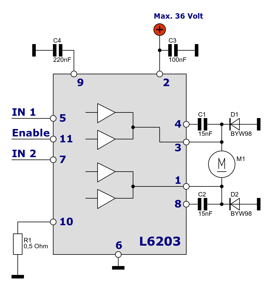 Dazu werfen wir einen ersten Blick in das Datenblatt: ![]() Pinout des L6203 im Multiwatt 11 Gehäuse Damit können wir so aber noch nichts anfangen. Deshalb wäre es sicherlich