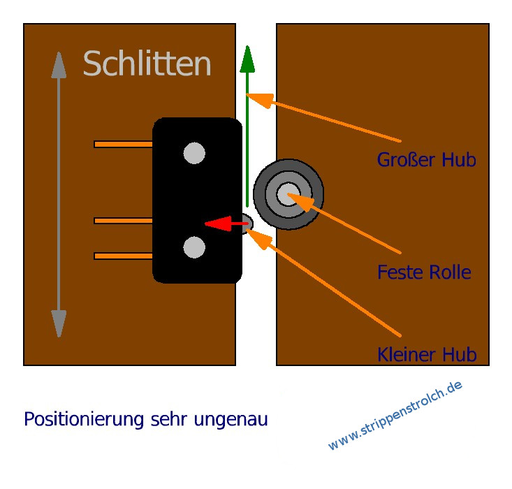 Nicht nur aus Kostengründen reizt den Bastler der Eigenbau, wobei die erforderliche Mechanik die eigentliche Herausforderung sein dürfte. Nach einigen Umwegen wurde ich bei einem Gleitlagerspezialisten fündig, der mir den passenden Linearantrieb zur Wandbefestigung liefern konnte. Der Antrieb erfolgt durch einen Gleichstrommotor, die Ansteuerung an das feststehende Zufahrtgleis (im Bild li. unten) wurde zunächst mittels Mikroschalter bewerkstelligt, was sich aber im Spielbetrieb als zu ungenau herausstellte.