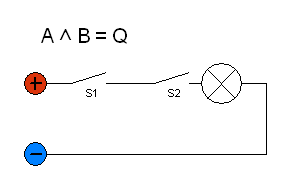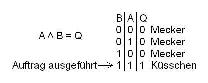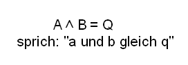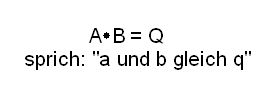 Nun haben wir ja auch ein wenig Mathematik gelernt und wissen, dass wir Variablen einsetzen können. Nennen wir also die Milch "A" und das Obst "B". Dann können wir auch gleich die Bedingung "Auftrag richtig ausgeführt" dem Buchstaben "Q" zuordnen. Der Auftrag hieße also nun "A mitbringen UND B mitbringen = Auftrag" Jetzt können wir