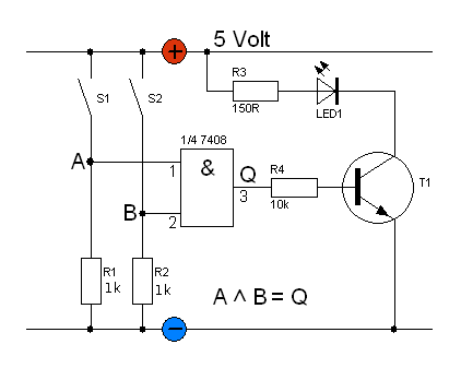 Die Plus- und Minusleitungen des Gatters zur Stromversorgung der Transistoren werden bei dieser Darstellung weggelassen, damit es übersichtlicher wird. Das "Kaufmanns-Und" bezeichnet hierbei genau unsere Verknüpfung, die das Gatter durchführen soll: "A UND B = Q". Nun ist es zwar so, dass die meisten Gatter eine logische "1" am Eingang annehmen, wenn sie nicht beschaltet werden, aber darauf kann man sich im Betrieb des Bausteines nicht immer verlassen, denn es könnten Störspannungen auftreten, die in die Eingänge hineingebracht werden. Also legt man die offenen Ausgänge entweder nach logisch "0" oder "1" mit einem Widerstand fest, damit die Störsignale keine Chance mehr haben, unseren Einkaufsauftrag zu beeinflussen: ![]() Wie wir sehen, ziehen die Widerstände R1 und R2 die Eingänge A und B auf logisch "0", wenn die Schalter offen sind. Schließen wir einen der beiden Schalter, so fällt an dem betreffenden Widerstand die komplette Betriebsspannung ab und wir erhalten eine logische "1". Bei erfüllter Bedingung A UND B wird der Ausgang ebenfalls das Signal "1" führen, das heißt, er wird auf Betriebsspannung hochgeschaltet. Dadurch wird unser Transistor (übrigens wieder unser guter alter "2 N 2222") leitend und die LED wird leuchten. Hier nun noch mal ein Plan, wie