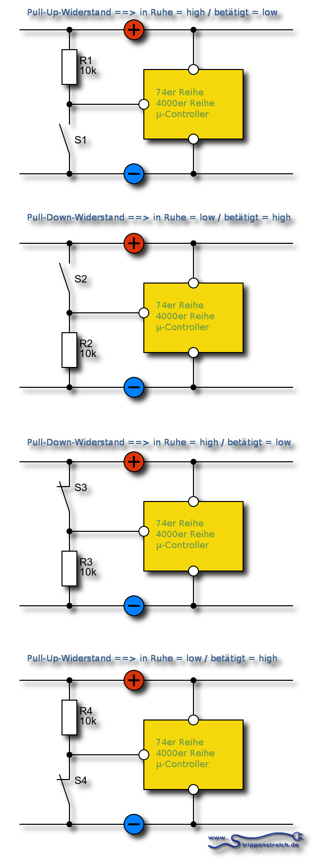 ![]() Wenn man einen Schalter als Eingang für CMOS 4000er, TTL 74er oder Controller wie z.B. C-Control, AVR, PICAXE, BASIC-Stamp abfragen möchte, so ergeben sich vier Möglichkeiten, wie man das machen kann. Ist der Widerstand mit Plus verbunden, so ist es ein Pull-up-Widerstand, ist er jedoch mit Minus verbunden, so handelt es sich um einen Pull-down-Widerstand. Als Schalter kann man sowohl einen Schließer als auch einen Öffner verwenden. ![]() |