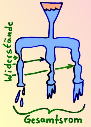 miteinander verbunden und dann noch einmal alle Beinchen „Nummer 2”. Als Schaltbild sieht das dann so aus: ![]() Je mehr Widerstände Du nun parallelschaltest, desto kleiner wird der Gesamtwiderstand. Es fließt also pro neuem Widerstand immer ein wenig mehr Strom durch die Gesamtschaltung. Das kann man auch wieder sehr gut am Wassermodell sehen: ![]() Oft möchte man wissen, wie groß denn nun der Gesamtwiderstand aus einer Parallelschaltung von Einzelwiderständen ist. Dazu nimmt man den Leitwert eines jeden Widerstandes, addiert diese Leitwerte und dann macht man aus dem Gesamtleitwert den Gesamtwiderstand. Unter