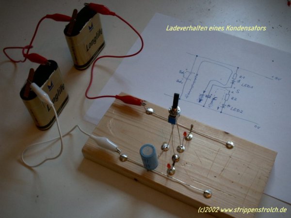 Das ist uns aber viel zu aufwändig, wir wollen lieber eine einfache Schaltung basteln, die uns das Verhalten eines Kondensators näher bringt. Wir benutzen dazu die Brettschaltung, da das dann sehr schön einfach wird. Bauteile: