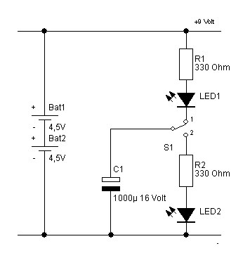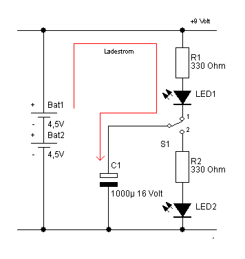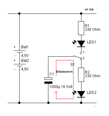 Durchführung: Baue damit folgende Schaltung auf: ![]() So könnte Deine Brettschaltung aussehen: ![]() ![]() Wenn du nun den Schalter in Position 1 bringst, dann fließt ein Strom durch den Widerstand R1 und die Leuchtdiode LED1 in den Kondensator C. Der Kondensator lädt sich dabei immer mehr auf und der Strom nimmt dabei immer mehr ab, bis er schließlich ganz aufhört zu fließen. Das kann man gut an der LED 1 beobachten. Wenn die LED 1 erloschen ist, ist der Kondensator geladen. ![]() Wenn du dann den Schalter in Position 2 schaltest, so wird der Kondensator über den Widerstand R2 und die LED 2 entladen, es fließt über diese Bauteile der Entladestrom. Das kannst du dann an der LED 2 beobachten. Wenn die LED 2 erloschen ist, ist der Kondensator "leer", also wieder entladen. ![]() Experiment: Besorge Dir verschiedene Kondensatoren mit unterschiedlichen Kapazitäten, etwa 50µF, 100µF, 2200µF und 4700µF (immer bitte mit möglichst 16 Volt, da die Bauteile später weiterverwendet werden sollen). Löte nun diese Kondensatoren anstatt des 1000-er Kondensators in die Schaltung und beobachte die Veränderungen im Verhalten der Schaltung. Wie lang sind die "Leuchtzeiten" nun ? Wirf die benutzten Reißbrettstifte nicht weg, denn die kann man immer wieder verwenden, genau so wie alle anderen Bauteile und das Brettchen. ![]() |
