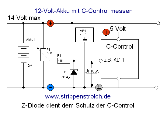 Verbraucher nicht. Da kannst Du mit einer C-Control eine Schaltung aufbauen, die die Akkuspannung misst. Überlegen wir mal folgende Schaltung: Die C-Control kann ja nur Spannungen bis 5 Volt am A/D-Eingang lesen. Um nun die Spannung des Akkus auf dieses Niveau herunterzuziehen, verwenden wir ein einfaches Poti P1. Der Widerstand R1 und die Z-Diode D1 verhindern, dass eine höhere Spannung als 4,7 Volt auf die C-Control trifft, falls man mal das Poti zu weit nach Plus aufdreht. Der Referenzspannungseingang der C-Control gehört natürlich an die stabilisierten 5 Volt Versorgungsspannung. Wir gehen nun folgendermaßen vor: Wir nehmen einen frisch geladenen Akku ohne Last (oder auch ein auf 14 Volt eingestelltes Labornetzgerät), klemmen ihn an das Poti an und stellen dann am Abgriff gerade die 4,7 Volt ein. Dazu beginnen wir bei Null Volt am Poti-Abgriff und nähern uns vorsichtig den 4,7 Volt. Nun wissen wir, dass bei 4,7 Volt unser Akku voll wäre. Den Rest erledigt die Software.