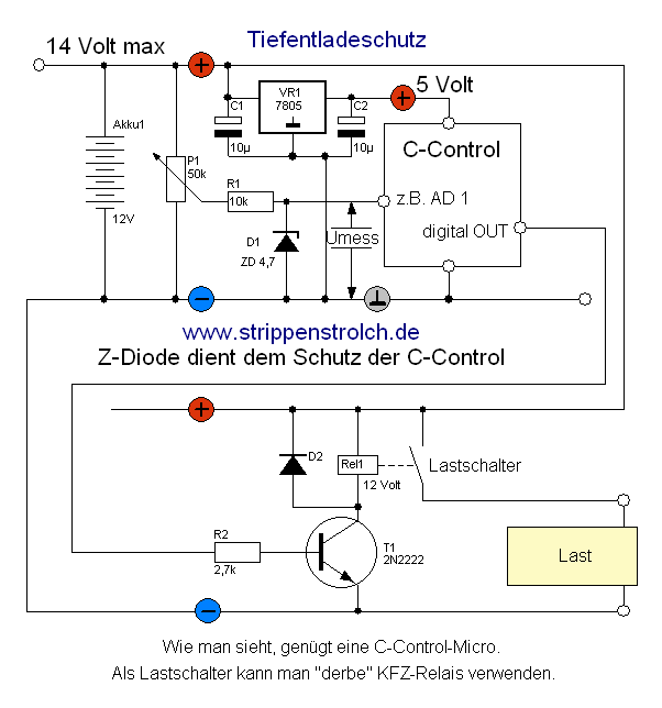 Man muss aber bedenken, dass eine C-Control mit allem Drum und Dran natürlich mehr Strom benötigt als professionelle Schaltungen. Aber bei Akkus um die 100 Ah dürfte das nicht unbedingt ins Gewicht fallen. An einem Ausgangspin löten wir dann einen kleinen Schalttransistor und ein Relais, so dass wir auch sehr große Lasten schalten können. Natürlich muss der Schalttransistor den Spulenstrom des Relais "wuppen" können. Der vorgeschlagene 2N2222 schafft maximal 800mA. Wer größere Relais benötigt, der sollte einen anderen Transistor einsetzen, z.B. einen BD 135. Es ist bei der Programmierung noch Folgendes zu bedenken: Die Akkuspannung erhöht sich nach Lastabschaltung und erniedrigt sich wieder, wenn die Last wieder zugeschaltet wird, was zu einem "Flattern" des Relais führen kann. Hier muss die Software eingreifen, vielleicht mit einer Hysterese. Auch eine Zeitverzögerung wäre denkbar. Man kann natürlich auch beides kombinieren. Der Vollständigkeit halber hier noch einmal der ganze Plan der Lastabtrennung für einen Tiefentladeschutz: Blei-Gel-Akkus sind besonders "dankbar", was die Parametrierung betrifft. |