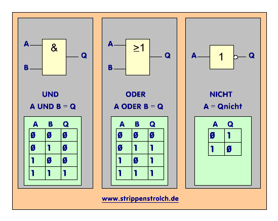 Hier noch einmal die Schaltsymbole aller drei Gatter auf einen Blick: Jetzt haben wir ja zwei Eingangssignale A und B, die wir je nach dem Zustand des Steuersignals C auf den Ausgang durchschalten wollen. Hmm... "Zappralot"...