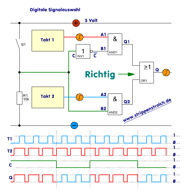 Naja, wir haben doch noch ein einfaches ODER-Gatter angesprochen. Und das setzen wir jetzt noch hinten dran: So, den Signallaufplan unten drunter kennst Du schon, und Du solltest jetzt auch gut erkennen, dass man das Taktsignal mit dem Schalter S1 ganz einfach auswählen kann. (ein ganz schnöder Schließer oder aber auch ein Controllerausgang oder ein Pin vom LPT-Port des PCs) Am Ausgang Q steht es dann in bester TTL-Qualität zu Verfügung. Noch ein Vorteil gegenüber einer Wechselschaltung mit einem Relais: Je nach