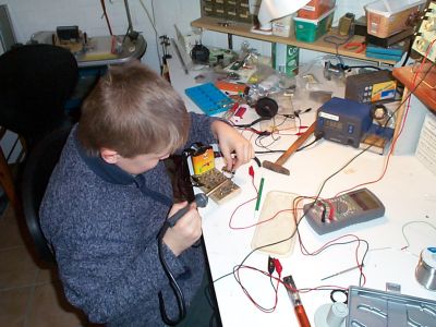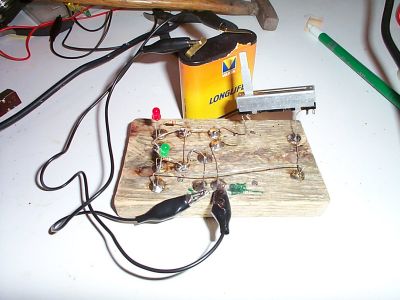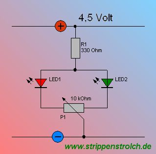 ![]() Wie Du siehst, sind der Vorwiderstand, die beiden LEDs und dann noch das Poti in Reihe geschaltet. Wenn Du nun das Poti ganz nach links drehst, so wird die grüne LED langsam dunkler und die rote LED wird immer heller. Genau so läuft das bei der anderen Drehrichtung ab. Dann wird die grüne LED immer heller und die rote LED immer dunkler. Es kann in einer Reihenschaltung immer nur ein gemeinsamer Strom fließen. Aber die beiden LEDs sind ja parallel geschaltet. Also teilt sich der Strom so auf, wie es das Poti vorgibt. Je nach Größe des eingestellten Widerstandes fließt mal mehr und mal weniger Strom durch den jeweiligen Diodenzweig. Beide Ströme addieren sich aber immer zum Gesamtstrom, der dann auch durch den Widerstand R1 fließt. Weil die beiden Ströme in den Diodenzweigen unterschiedlich sein können, leuchten auch die LEDs unterschiedlich hell. ![]() Diese Schaltung hat Jan erfunden und er machte sich auch gleich daran, sie aufzubauen und auszuprobieren. Es funktionierte vorzüglich, man konnte sehr schön sehen, wie das Poti die beiden LEDs dimmte. ![]() Das Ganze wurde auf ein kleines Brettchen aufgebaut. |