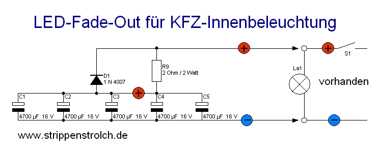 schließe. Das Ganze soll möglichst einfach werden." Nun ja, da kann man mit PWM arbeiten oder sogar mit einem Controller oder sonstigen ICs, aber ich schlug Folgendes vor: Wenn der Schalter geschlossen wird, laden sich die parallelgeschalteten Kondensatoren über den Strombegrenzungswiderstand auf und gleichzeitig geht die Innenbeleuchtung (hier mal LEDs) an. Wenn nun der Schalter wieder geöffnet wird, so entladen sich die Kondensatoren über die Diode D1 und lassen die LEDs (gern auch die vorhandene Lampe) weiterhin leuchten. Nun entladen sich die Kondensatoren und die LEDs (Lampe) wird langsam dunkler, bis sie aus sind. Achtung:Der Widerstand muss unbedingt eingebaut werden, denn sonst "fetzt" es die zugehörige Sicherung heraus, da die Kondensatoren im Einschaltmoment wie ein Kurzschluss wirken. Um den richtigen Wert der Kondensatoren zu ermitteln, fange am besten mit etwa 4700µF (mind. 16 Volt) an und erweitere die "Kondensatorbank" einfach durch Parallelschalten weiterer Kondensatoren, bis die richtige Nachleuchtdauer erreicht ist. Achtung:Bei weißen LEDs könnte es vorkommen, dass sie nicht ganz bis ins Dunkle dimmen, und vorher einfach ausgehen. Daher vorher mal einen Versuch machen mit einer einzelnen weißen LED und einem einzelnen Kondensator. Übrigens kann man die Schaltung auch einfach direkt parallel zur vorhandenen KFZ-Innenlampe schalten, ohne großatrig Kabel verlegen zu müssen. Das sieht dann einfach so aus: Wie man sieht, kann man die Schaltung direkt an die vorhandene Innenleuchte anklemmen. Dazu könnte man die Leuchte im "Himmel" des Fahrzeuges ausbauen und die Schaltung mitsamt der Platine in den "Himmel" schieben und danach die Leuchte wieder einbauen. So muss man noch nicht einmal Kabel zur Fahrzeugtür verlegen.. |