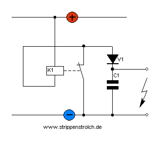 ich am einfachsten hohe Spannung? Es wird hier die Selbstinduktion der Relaisspule ausgenutzt und auf den Kondensator geleitet. Meine Oszilloskop-Messungen ergaben mit einem 12-Volt-Relais ohne Last Spitzenspannungen so um die 2500 Volt. Wenn das Relais anzieht, unterbricht es sich selbst seinen Spulenstrom, fällt daher wieder ab. Dadurch wird der Kontakt wieder geschlossen, das Relais zieht wieder an und die Geschichte fängt von vorne wieder an. Durch diesen Mechanismus öffnet und schließt das Relais sehr schnell hintereinander, und es ergibt sich ein schnarrendes Geräusch. Ist der Kontakt geschlossen, fließt Strom und die Relaisspule baut ein Magnetfeld auf. Öffnet nun der Kontakt, bricht das Magnetfeld mangels äußerer Stromzufuhr zusammen. Dadurch entsteht in der Spule Elektrizität, und zwar mit ziemlich hoher Spannung, bei meinen Versuchen mit einem 12-Volt-Relais von Finder etwa 2500 Volt. Das ist die viel zitierte Selbstinduktion. Die hohen Spannungsspitzen werden nun über die Diode geschickt und in dem Kondensator gespeichert. Wenn man an den Kondensator zwei spitze Drähte anschließt und die Drahtenden dicht zusammenführt, so kann ein Funke von etwa 2 mm überspringen, wenn die Raumluft schön trocken ist. Ebenso kann man eine nahezu beliebige Glimmlampe an den Kondensator anschließen und wird sehen, dass sie leuchtet. ![]() Man kann es auch einmal mit einer Leuchtstoffröhre versuchen (nur die "nackte" Röhre, ohne Fassung oder Vorschaltgerät, je einen Draht an je einem Ende der Röhre). Ich kann mir vorstellen, dass bei kleineren Röhren bereits Leuchterscheinungen auftreten. Bitte darauf achten, dass der Kondensator hinreichend spannungsfest ist (KEIN Elko!), weil sonst der Kondensator durchschlagen könnte und die schöne Hochspannung zunichte macht. Diode und Kondensator können auch weggelassen werden, aber bei meinen Versuchen war das Ergebnis mit diesen Bauteilen einfach besser. Die Schaltung ist bei 12 Volt Betriebsspannung recht ungefährlich, obwohl man doch "sehr starke Spannungen" erzeugen kann, die man deutlich fühlt. Nebenbei: Wenn ein Transistor ein Relais schaltet, entstehen beim Ausschalten wie beschrieben hohe Spannungen, die den steuernden Transistor zerstören können. Damit dies nicht geschieht, schließt man in diesem Anwendungsfall die Induktionsspannung mit einer sogenannten "Freilaufdiode" kurz. [Bild hier -- Verbindung zu "Relaisverzögerung" herstellen, hier und dort.] ![]() Bitte