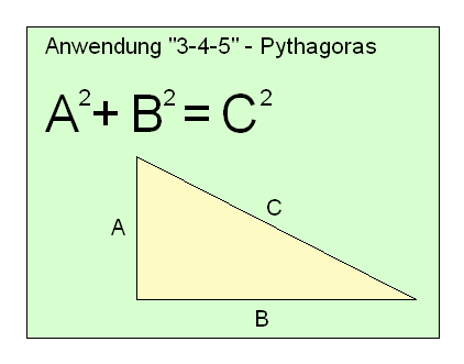 verlegen." "Ja, Meister, aber mein Geodreieck habe ich zuhause und es ist wohl auch zu klein dafür. Das wird doch fürchterlich ungenau..." "Du meine Güte, hast du denn noch nie etwas von 3-4-5 gehört?" "Nee, Meister, was ist denn das?" So oder so ähnlich könnte sich ein Gespräch irgendwo auf der Baustelle abgespielt haben. Was ist aber nun 3-4-5? Was soll das sein? Das Geheimnis ist ganz einfach zu lüften: Wir kennen doch alle den alten Pythagoras, der unter anderem herausgefunden hat, dass die Summe der beiden Kathetenquadrate gleich dem Hypotnusenquadrat ist, wenn das Dreieck rechtwinkelig ist. Hä? Sagen vielleicht einige von Euch. Nun ja. Also hier mal ein rechtwinkeliges Dreieck: Wie wir sehen, befindet dich der rechte Winkel zwischen den beiden Katheten und gegenüber der Hypothenuse. Die Hypothenuse ist die längste Seite in einem rechtwinkeligen Dreieck. Wenn wir die beiden Katheten A und B nennen und die Hypothenuse C, dann hat Pythagoras folgende sehr bekannte Formel herausgefunden: Es ist also so, dass das Quadrat von A plus dem Quadrat von B gleich dem Quadrat von C ist. Und wenn sich das so verhält, so haben wir ein 100% rechtwinkeliges Dreieck. Schon damals überlegten die Baumeister sehr scharf. Sie hatten aber kein lasergesteuertes Instrument, um einen rechten Winkel in den Sand zu malen. Also suchten sie nach ganzen Zahlen, die die geforderte Bedingung erfüllen. Die kleinsten ganzen Zahlen, die dieses aber tun, sind 3, 4 und 5, wie die nächste Grafik verdeutlicht: Es ist nämlich so, dass 3 zum Quadrat 9 ergibt, 4 zum Quadrat gleich 16. Das beides addiert ergibt dann 25, was wiederum genau das Quadrat aus 5 ist. Du benötigst also eine Maurerschnur, ein Kabel, oder einen Bindfaden, der ein wenig länger als 3+4+5, also 12 Meter ist und machst folgendes: