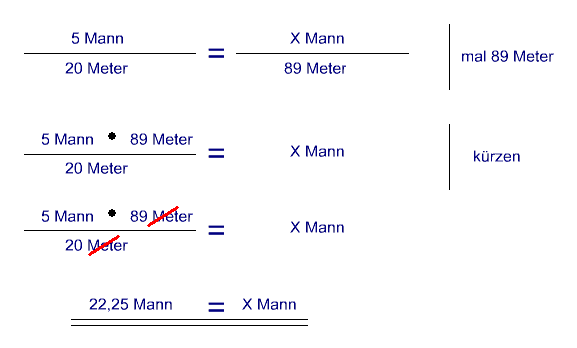 Ebenso geht es dem Bauunternehmer, der pro Tag mit 5 Mann 20 Meter Fundament schafft. Am nächsten Tag möchte der Bauherr aber 89 Meter gebaut haben. Wieviel Mitarbeiter muss der