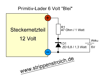 Die Z-Diode beginnt genau bei 6,8 Volt zu leiten, so dass der Bleiakku nur bis zu 6,8 Volt voll geladen wird. Dadurch kann der Akku keinesfalls überladen werden, denn seine eigentliche Ladeschlussspannung wäre bei 7,2 Volt. Als Netzteil dient ein allgemeines Steckernetzteil, aus dem Gleichstrom herauskommt, oder sogar eine kleine Solarplatte mit 12 Volt peak. (Bei Solarbetrieb muss noch eine Diode in Ladestromrichtung vor den Widerstand geschaltet werden.) |