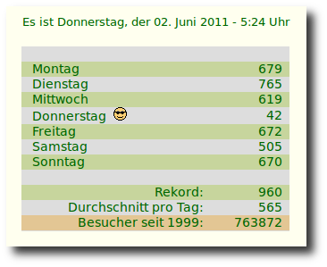 ![]() 2011 ==> Anfang 2011 versuchte ich, den strippenstrolch.de nochmals in ein Wiki zu überführen. Aber technische Probleme zeigten mir auf, dass es besser ist, die HTML-Technik beizubehalten. Also überarbeitete ich zum elften mal die Seiten und sie erscheinen nun in einem angenehmen Grün-Gelb. Die Fräse machte jetzt auch Fortschritte und so wurde der "Maschinenraum" auf die Nutzung von RS232-Schnittstellen ausgelegt: ![]() X-Y-Z-Maschine um 2011 Die Statistik von