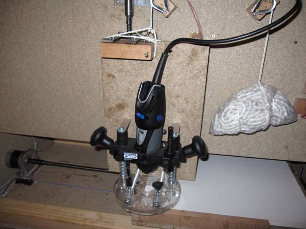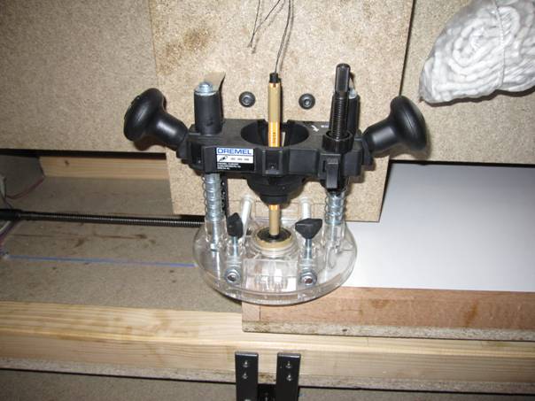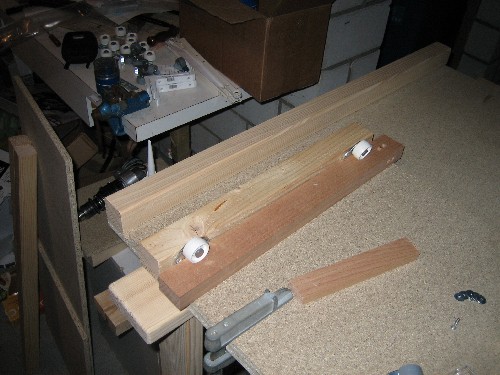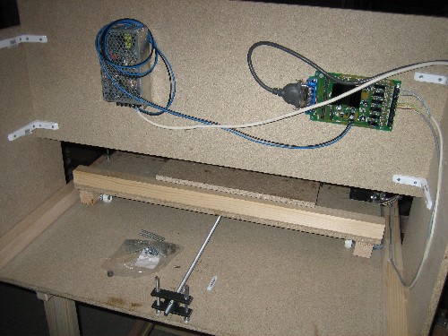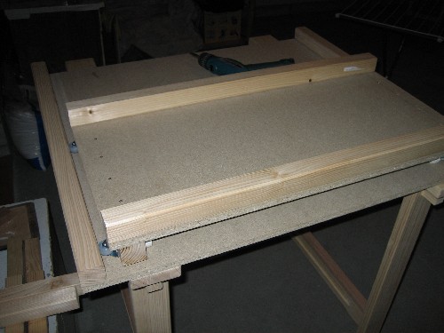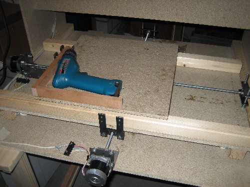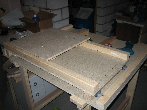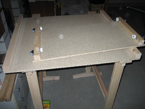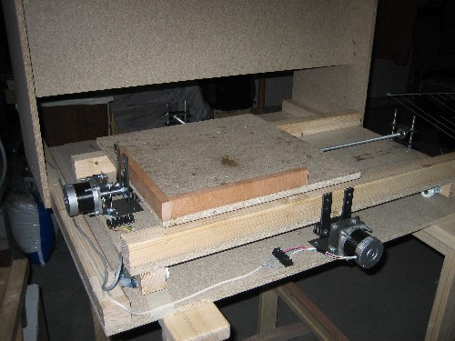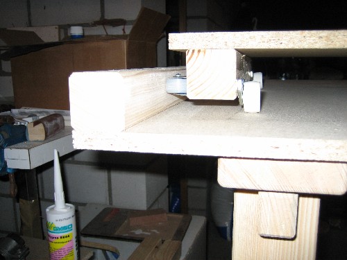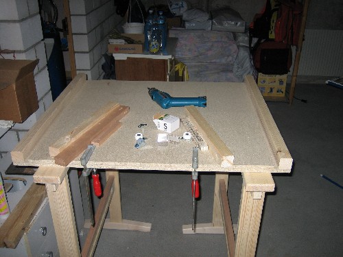 Florian schreibt: Also, ich erzähle euch jetzt mal meine Geschichte, meines Fräsplotter-Projekts. Angefangen hat es Damit, dass ich die Projekte von Stephan (strippenstrolch.de) mit grossem Interesse verfolgt habe. Bis dahin waren es aber bloß Gedanken. Einige Zeit später hab ich dann den Arbeitsplatz gewechselt und somit beruflich mit einigen CNC Steuerungen zu tun bekommen. Die Faszination wurde größer, und ich begann mit dem Gedanken zu spielen, einen eigenen Fräsplotter zu konstruieren. Ich hab dann vermehrt im Internet zu dem Thema zu recherchieren begonnen, mir Tipps und Ideen zusammengetragen. Eines Tages war es dann soweit, ich hab in einer langweiligen Stunde die Pläne gezeichnet, wie der Plotter etwa aussehen sollte. Kaum war das zu Papier gebracht, bin ich in den Baumarkt gefahren, und hab mir alle groben Holzplatten und Leisten zuschneiden lassen, da ich Zuhause nicht eingerichtet bin, um dies effizient und genau zu erledigen. Der eigentliche Bau konnte beginnen. Die Grundplatte, auf 2 Arbeitsböcken aufgelegt. Auf der Seite die 2 Führungen, für die Y-Achse: Die "Rollböcke" der Y-Achse.
