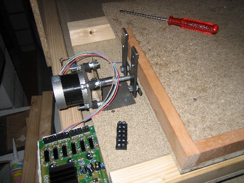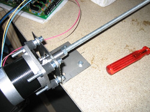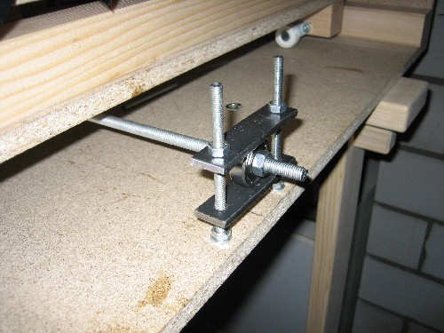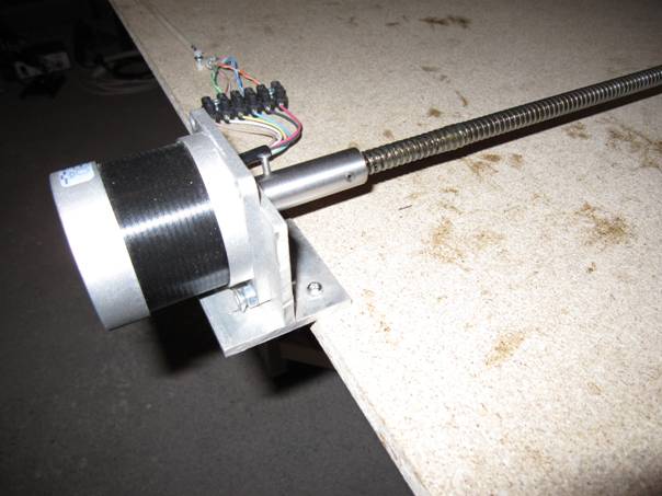 So, dann fehlten nur noch Aufhängungen für die Motoren, Lager für die Schlitten und Führungen der Achse, gegenüber den Motoren. Da ich in einer mechanischen Werkstatt arbeite, die mit Frästisch, Drehbank usw. ausgerüstet ist, war das alles kein Problem. An einem etwas arbeitsärmeren Abend machte ich mich dahinter. Das sah dann etwa so aus. Der Motor an der Aufhängung: Die Schiebelager an den Tischen: