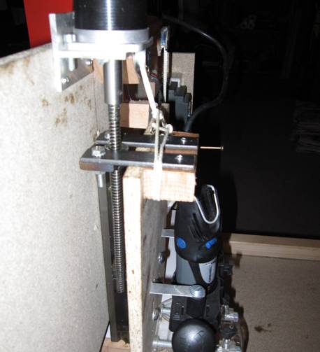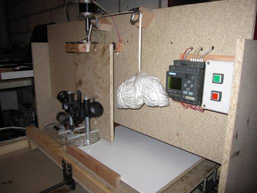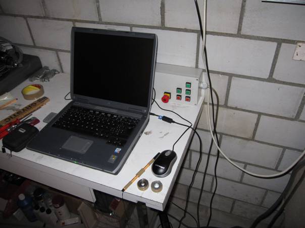 ![]() Der weisse Sack auf der Seite ist das provisorische Gegengewicht zur Z-Achse, sodass der Motor eigentlich kein Gewicht anheben muss. Funktioniert einwandfrei. Später werde ich den Sack vermutlich noch durch eine Feder ersetzten. Rechts im Bild sieht man noch ein Logikmodul, das die ganze Steuerung der Maschine übernimmt. Später mehr dazu. Hier noch die