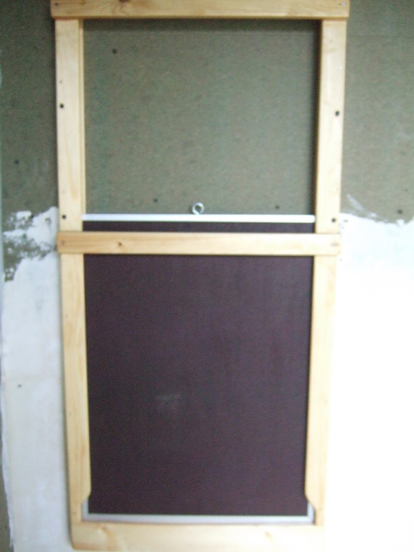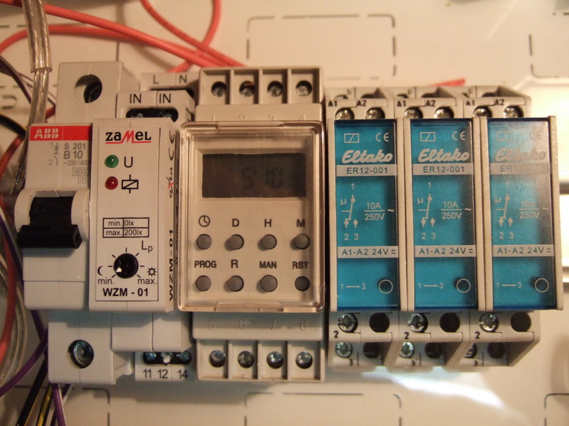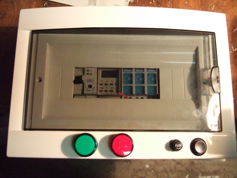 Automatische Hühnerklappe Aufgabenstellung: Die Klappe soll morgens per Zeitschaltuhr aufgehen, damit die Nachbarn ganz sicher ausschlafen können, also fällt eine reine Dämmerungsschalterlösung aus. Abends fällt die Zeitschaltuhr aus, weil die Viecher erst in der Dämmerung rein wollen und das kann zeitmäßig ziemlich schwanken. Also Zeitschaltuhr morgens, Dämmerungsschalter abends, plus Möglichkeit der manuellen Steuerung. Die Anlage sollte so lange und so viel wie möglich stromlos sein und nur im Betätigungszeitraum mit Strom versorgt werden. Mechanisch wird die Klappe durch ein Seil geöffnet und geschlossen das mit dem Arbeitszylinder verbunden wird, so dass eine Quetschung der Hühnchen ausgeschlossen ist. Folgende Materialien stehen zur Verfügung und teure neue Bauteile sollen nicht angeschafft werden: - Trafo 24V aus einem Krankenhausbett - 1 Okin Linearantrieb 24V 400mm Hub und automatischer Endabschaltung in beiden Richtungen auch aus dem Krankenhaus - 3 Eltako Stromstoßschalter (1x 1 Schließer / 2x 1 Schließer - 1 Öffner) - 1 Zeitschaltuhr für Hutschieneneinbau - 1 Dämmerungsschalter für Hutschieneneinbau ![]() Funktion: Auf der Skizze ist die Anlage stromlos in Nullstellung und die Klappe ist geschlossen. Der Dämmerungsschalter ist durch den Eltako (A) vom Netz getrennt. Die Zeitschaltuhr schaltet morgens den Strom für ca. 1 Minute auf den Trafo durch. Durch den 24V Strom ziehen alle Eltakos (A, B, C) an und der Motor läuft bis zu seiner integrierten Endabschaltung. Durch den ersten Eltako (A) wird Strom auf den Dämmerungsschalter aufgeschaltet, der aber durch das Tageslicht noch nicht durchschaltet. Ist die Minute vorbei, ist die Anlage stromlos und die Klappe oben. Abends schaltet der Dämmerungsschalter den Strom wieder auf den Trafo, die beiden Eltakos (B + C) ziehen an und kehren dadurch die Drehrichtung des Motors um. Die Klappe läuft also nach unten, bis der integrierte Endschalter den Linearantrieb abschaltet. Damit aber auch der Trafo stromlos wird, ist unten ein Endtaster angebracht, der über den ersten Eltako (A) den Dämmerungsschalter vom Netz nimmt. Am nächsten morgen schaltet die Uhr wieder den Strom auf und alles passiert wie oben beschrieben, wieder mit geänderter Drehrichtung. Bei manuellem Betrieb muss der Taster so lange gehalten werden, bis der Linearmotor in die Endabschaltung läuft. Folgendes ist hier zu beachten: Ist die Klappe auf und wird tagsüber manuell geschlossen ist alles OK. Die Klappe ist dann zu und der Endtaster hat den Dämmerungsschalter vom Netz getrennt. Öffnet man die Klappe Nachts, ist zu beachten, dass sie auch manuell wieder geschlossen wird, ansonsten würde die Steuerung komplett falsch laufen! Mögliche Probleme: - Sollten die beiden Eltakos (B + C) nicht exakt synchron schalten, gibt es einen kurzzeitigen Kurzschluß. Können Dioden helfen? - Die manuelle Betätigung Nachts (Vielleicht Warnleuchte, damit das Schließen nicht vergisst?) - Die Einschaltimpulse an die Eltakos sind 1min (Zeitschaltuhr) und 30sek (Dämmerungsschalter). Können die dadurch überlasten? Einige Impressionen: