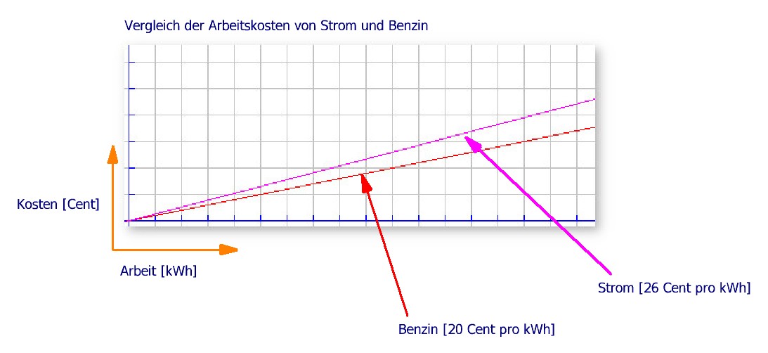 1 Liter Benzin kostet zurzeit rund 1,70 Euro. Das heißt, für 1,70 Euro bekomme ich 8,5 kWh Arbeit. Das macht also 20 Cent pro kWh. Jetzt kommen wir zu dem Strompreis: Bei 26 Cent pro Kilowattstunde kosten 8,5 kWh Strom 2,21 Euro !!! Die folgende Grafik verdeutlicht