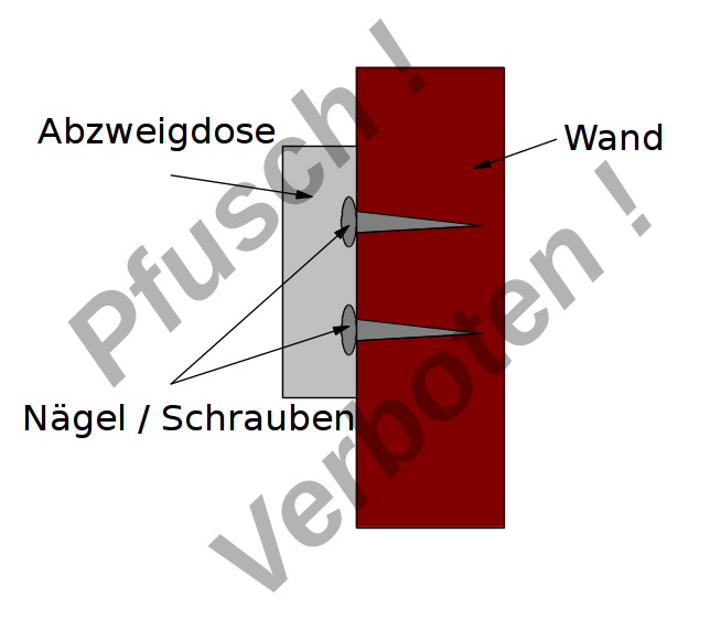 ![]() Oft sieht man, dass z.B. Bauteile mit Schrauben im Inneren festgeschraubt werden und diese Schrauben dann durch das Gehäuse nach außen ragen. Das darf in diesem Fall nicht sein. Auch darf man keine Schrauben und Nägel einfach durch die Rückwand von Abzweigdosen treiben. Leider sieht man das immernoch sehr oft. Das ist lebensgefährlich, denn bei einer Störung innerhalb der Abzweigdose könnte dann die ganze Wand unter Spannung stehen, auf der die Abzweigdose montiert ist. ![]() Wer unbedingt etwas mit Schrauben befestigen möchte, die nach außen ragen, der sollte zu Nylonschrauben greifen, die es inzwischen in den einschlägigen Elektronik-Versandhäusern zu kaufen gibt: ![]() Ich wünsche allzeit unfallfreie Installationsarbeiten. Netzspannung ist lebensgefährlich !!! Viel Erfolg, ![]() |