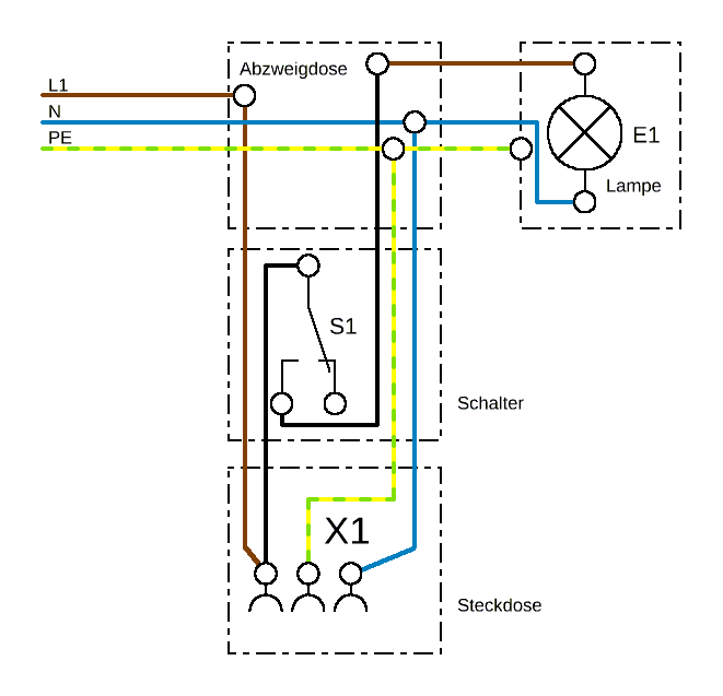 Wie man ganz deutlich sieht, hat man die Schaltung so zu verklemmen, dass der Außenleiter geschaltet wird (schwarze Ader) und der Null an der Lampe "verbleibt" (blaue Ader). Anderenfalls könnte man die Lampe zwar trotzdem ausschalten, aber die Lampenfassung stünde auch im ausgeschalteten Zustand unter Spannung. Man an könnte dann trotz ausgeschalteter Lampe einen Stromschlag bekommen, wenn man z.B. eine defekte Glühlampe auswechseln möchte. Bei einer Lampenfassung sollte stets der Fußkontakt mit dem geschalteten Außenleiter verbunden sein und das Gewinde der Fassung mit dem Neutral-Leiter. Dadurch wird ein Berühren der Netzspannung noch besser vermieden, da man normalerweise den Fußkontakt der Fassung nur recht schwer berühren kann, das Gewinde aber sehr leicht. Bitte also darauf achten, dass man die Lampenfassung nicht einfach "irgendwie" anklemmt. Bei metallenen Gehäusen ist der