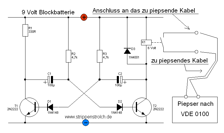 dabei behilflich ist. Wie soll man denn da vernünfitg vorankommen ?Nun ja, da kann eine kleine Schaltung helfen, die man sich bauen kann. "Der Auszubildende in der Schachtel". Das funktioniert folgendermaßen: Wenn man ein bestimmtes Kabel durchpiepsen (oder klingeln) will, so muss man oft jemanden an das andere Ende stellen, der die einzelnen Adern zusammenhält und wieder voneinander löst, damit ein periodischer Kurzschluss auftritt und man zweifelsfrei feststellen kann, dass man auch die richtigen Adern erwischt hat. Es könnte ja sein, dass irgendwo ein Schalter dazwischen ist, der die Adern brückt und man bekäme einen Dauerton und wüsste immer noch nicht, ob man die richtigen Adern gefunden hat. Dazu braucht man normalerweise 2 Leute, aber mit der hier vorgestellten Schaltung geht es auch allein. ![]() Du baust dir einen Multivibrator auf, der in einem Zweig ein Relais eingebaut hat. Dieses Relais wird periodisch anziehen und abfallen. Den Relaiskontakt klemmst du "anstatt des Auszubildenden" an die kurzzuschließenden bzw. durchzupiepsenden Adern an. Nun wird das Relais periodisch einen Kurzschluss auf diesen Adern verursachen und du kannst das andere Ende mit einem handelsüblichen Durchgangsprüfer nach VDE 0100 suchen. Wenn der Durchgangsprüfer periodisch anzeigt, so hast du die beiden Adern gefunden. Viel Erfolg beim Durchklingeln, und möge der Auszubildende