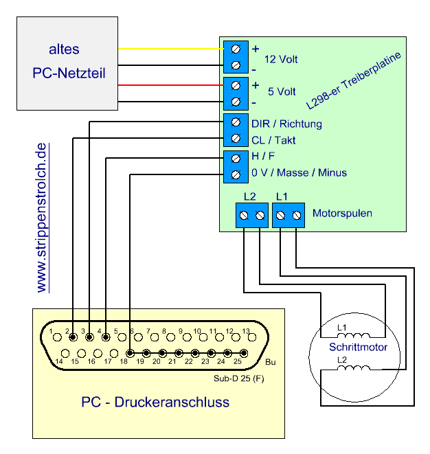 Der Eingang H/F (half / full) muss zwingend auf Minus, bzw. plus 5 Volt gelegt werden, wenn der Schrittmodus fest vorgegeben werden soll, bzw, wenn du ihn nicht programmieren möchtest. So sparst Du Dir jeweils ein Bit am Druckerport und kannst mit den "normalen Datenleitungen" D0 bis D7 bis zu vier Motoren gleichzeitig unabhängig voneinander steuern. Gut passende Motoren: Klein: ![]() Link zum Pollin-Shop Mittel: ![]() Link zum Pollin-Shop Groß: ![]() Link zum Conrad-Shop Mit