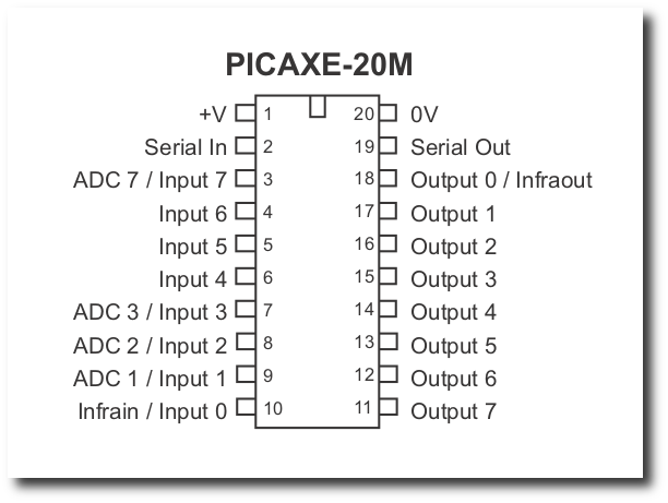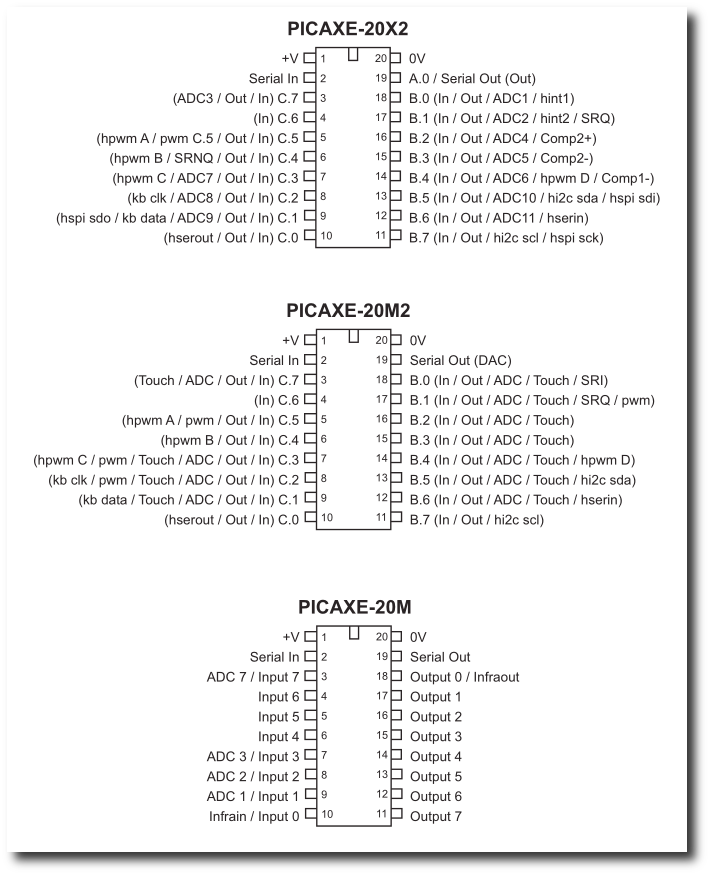 ![]() Pinout aller 20er Bausteine: ![]() -------------------------------------------------------------------------------------------------------------- Ich wünsche viel Vergnügen beim Experiementieren mit der Picaxe, ![]() |