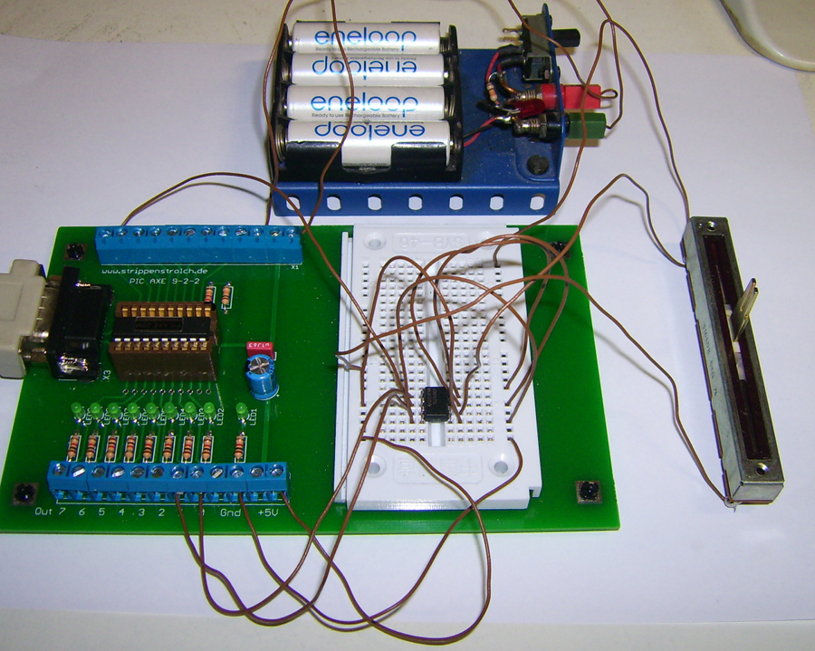 dass ich dieses Erkundungsblog schrieb. In früheren Zeiten hatten die µ-Conroller noch keinen AD-Wandler-Eingang und so musste man sich damit behelfen, separate Wandler-ICs zu verwenden. Eines dieser ICs ist der 8-Bit-AD-Wandler TLC549. Er wird im guten alten DIP-Gehäuse angeboten und wird sicherlich auch als SMD-Baustein verfügbar sein. Also zuckeln wir erstmal