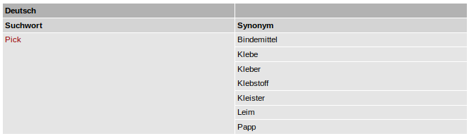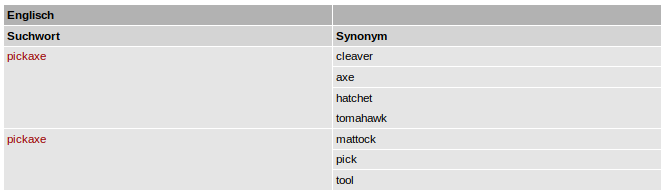 Das ist auch der Grund, warum ich für den Baustein die weibliche form wähle, also "DIE Picaxe". DIE Axt. Eine weitere Suche über die Synonyme ergab dieses Ergebnis: ![]() Hier sichte ich noch einmal weiter über "pick": ![]() Aha: Kleber-Axt.