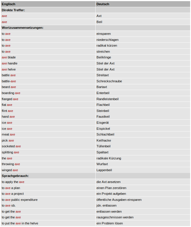 1. "PIC" 2. "AXE" Der erste Teil "PIC" bezieht sich auf den zugrundeliegenden Mikrocontroller. In der Wikipedia ist dieser Mikrocontroller unter "Picmicro" in der Suche leicht zu finden: https://de.wikipedia.org/wiki/PICmicro Dort stehen sehr viele Informationen über den Mikrocontrollertyp. Der zweite Teil "AXE" ist aus dem Englischen entlehnt und hat wiederum zwei Bedeutungen: 1. "AXE" = Die Axt. 2. "axe" = einsparen Ich habe aber einmal bei www.woerterbuch.info nachgeguckt und diese Tabelle gefunden: ![]() Der weitaus größere Teil der Vokabeln bezieht sich also eher auf "Axt".