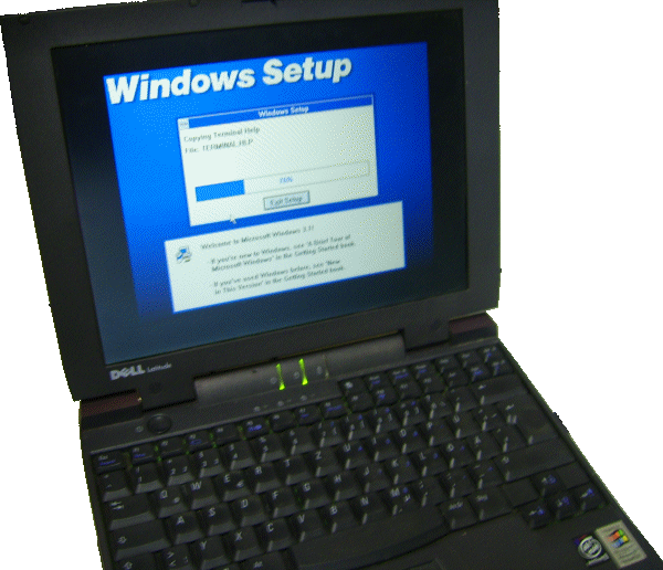 Ich begab mich also wieder zu dem alten spinnenverwobenen Dikettenkasten hin und holte 7 Disketten heraus, die ich nicht mehr brauchte, formatierte sie und schrieb die Ordnerinhalte auf die Disketten. Danach noch jeweils ein sauberes Etikett drauf, damit ich die Disketten nicht verwechselte. Nun bin ich wieder zum Notebook zurück geschlurft und versuchte, Windows 3.1 zu installieren. Aber drei der alten Disketten waren wohl so alt, dass sie Lesefehler hatten. Ok, noch mal drei neue Disketten gemacht, neue Etiketten drauf. Jetzt klappte die Installation hervorragend: ![]() Nach erstaunlich geringer Zeit
