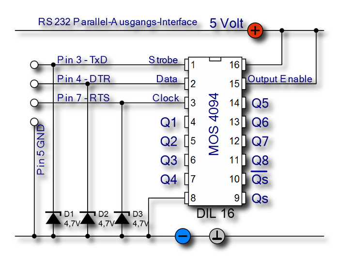 Wie schon erwähnt, kümmern wir uns nicht um den Freigaber eingang und legen ihn auf plus 5 Volt, so dass das IC also ständig frei gegeben ist. Alles, was wir nun noch machen müssen, ist die richtige Verschaltung der Ausgangspins der RS 232 mit dem MOS 4094. Dabei müssen wir bedenken, dass eine serielle Schnittstelle bis zu plus / minus 15 Volt "heraus haut". Das ist aber relativ unrkitisch, denn eine vernünftige RS232 Schnittstelle ist von Haus aus kurzschlussfest. Daher können wir diese 15 Volt auch einfach mit jeweils einer 4,7 Volt Z-Diode "entschärfen" und auf die 5 Volt bringen. Für die nötige Strombegrenzung sorgen Schutzwiderstände innerhalb der Schnittstelle. Ich habe auf meinem kleinen Versuchsfeld einmal folgende Beschaltung gewählt: ---------------------------------------------------------------------------------------------------------------------- Viel Erfolg beim Datenschieben,
