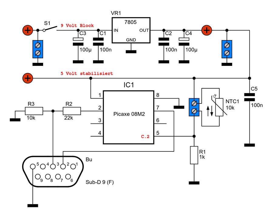 Die temperaturabhängige Spannung holt sich die Picaxe über den ADC-Eingang C.2 als analogen Wert und gibt ihn als digitalen Wert (0...255) ständig an eine RS232-Schnittstelle aus. Ein Gambas-Programm greift auf die serielle Schnittstelle zu, verarbeitet den ankommenden Datenstrom und zeigt die Temperatur an. Hier ist das sehr einfache Lese- und Schreibprogramm für die Picaxe: main: ' Start der Schleife readadc C.2, b1 ' Wert an PIN 5 einlesen und in Variable b1 speichern 'debug ' Zur Kontrolle der eingelesenen Werte 0..255 an Pin 5 sertxd (b1) ' Wert b1 schreiben goto main ' Programm neu abarbeiten (Loop) Das dazu gehörige Gambas-Programm (Gambas 2) kannst Du hier herunterladen: Download