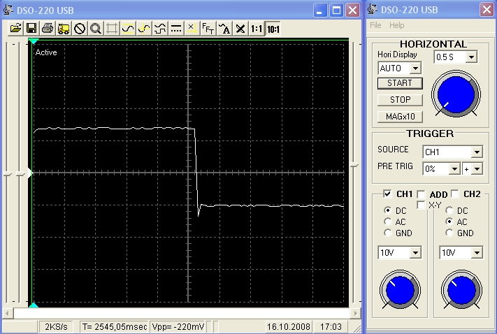 ![]() Man sieht hier also eine rechteckige Wechselspannung und das Oszilloskop nimmt uns sogar die Arbeit ab, die Kästchen in X-Richtung zu zählen. Es steht dort unten in der Infoleiste: 2545,05 msec. Das kann man aber auch heraus bekommen, wenn man sich die Einstellung für "horizontal" anschaut. Dort habe ich 0,5 Sekunden pro Kästchen eingestellt. Wenn man nun die Kästchen zählt, kommt man auf etwa 5 Kästchen "und ein paar Zerquetschte", bis die Kurve nach unten abknickt. Also schafft der Schlitten eine Hublänge in ca. 2,5 Sekunden. Für die