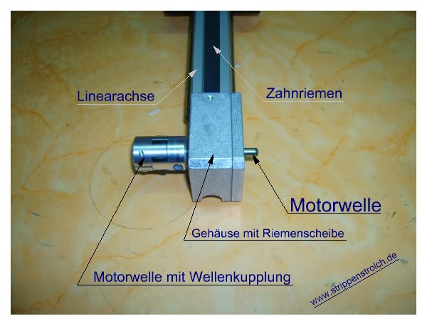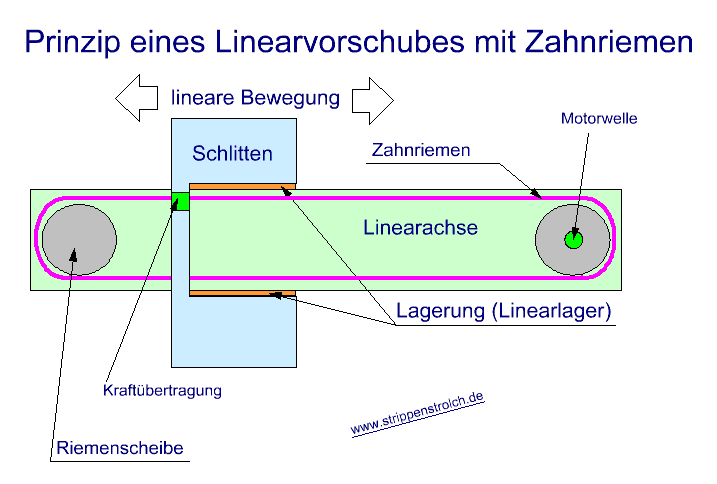 Bei der Art des Antriebs können wir grob in Spindelantrieb und Zahnriemenantrieb unterscheiden, alles Andere wird dann schon sehr speziell. Also zunächst einmal ein Vorschub mit Spindelantrieb: Die Spindel (lila) ist ähnlich wie eine Gewindestange aufgebaut (sieht also aus wie eine große lange Schraube), nur natürlich viel genauer und hat auch eine andere Steigung (Vorschub pro Umdrehung). Die lila Spindel wird also vom Motor gedreht und im grünen Kästchen sitzt eine Art Mutter durch die die Spindel hindurch führt. An dem Grünen Kästchen wird also die Kraft übertragen und die Rotation der Spindel in die lineare Bewegung umgewandelt. Je nachdem wie sich der Motor dreht (rechts herum oder links herum) wird also der Schlitten mal vorwärts und mal rückwärts bewegt. Die Spindeln können als Trapezspindeln oder aber auch als Kugelumlaufspindeln ausgeführt sein. Bastler nehmen dafür auch gern mal einfache Gewindestangen aus dem Baumarkt. Die andere gebräuchliche Variante ist der Linearvorschub mit Zahnriemenantrieb: Hier wird ein Zahnriemen über zwei Riemenscheiben geführt, wobei die eine Riemenscheibe von dem Motor angetrieben wird. Im geraden Teil macht der Zahnriemen ja bereits eine lineare Bewegung und braucht im Prinzip nur noch an dem Schlitten befestigt zu werden (grünes Kästchen). An der angetriebenen Riemenscheibe schaut dann seitlich eine Welle heraus, an die der Motor angebaut werden kann: Prima, prima, wir wissen also nun, dass mir die Firma ISEL einen Linearvorschub mit Zahnriemenantrieb zur Verfügung stellte. Jetzt stellt sich natürlich die Frage, was wird mit solchen Antrieben gemacht, bzw. was kann ich hier mal auf dem strippenstrolch.de daraus basteln ? Nun, Nico und ich setzten uns auf die Terrasse, Nico trank eine Brause und ich schlürfte mal wieder einen Pott Kaffee.... ![]() ... brrruummm